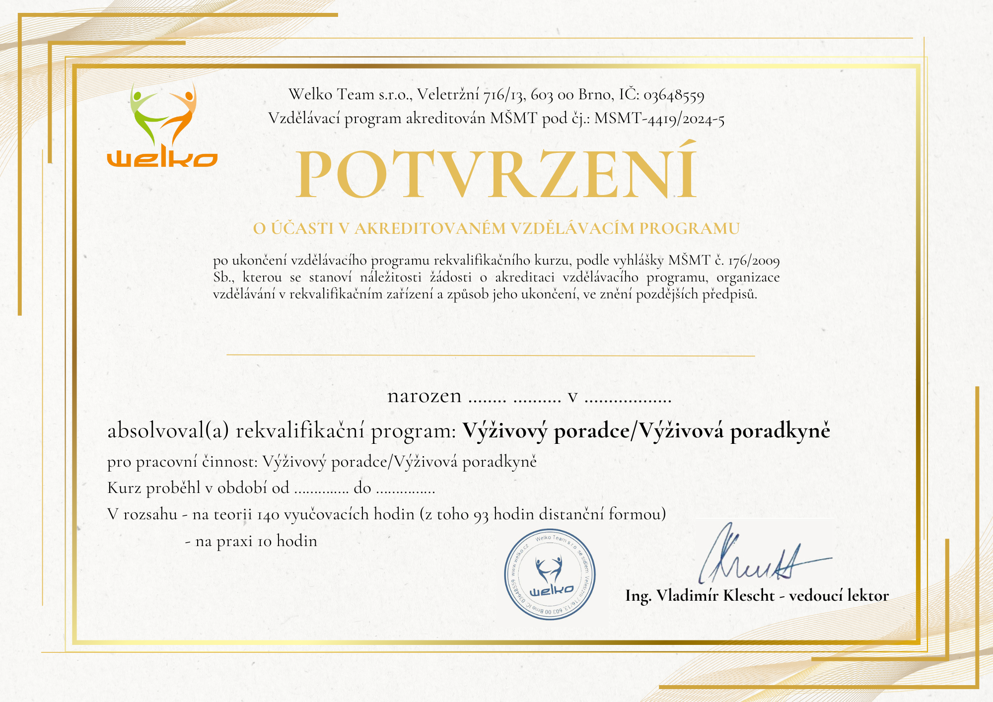 - Kurz Výživový poradca s potvrdením o účasti v rekvalifikačnom vzdelávacom programe